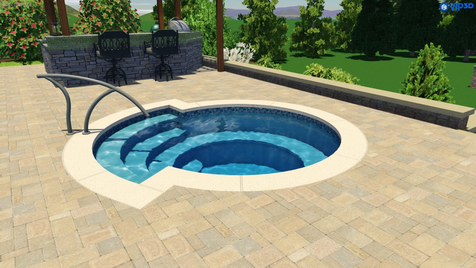 Two sets of curved entry steps grace the pool's shallow end, alongside convivial bench seats. There's lots of room to sit back and socialize.
